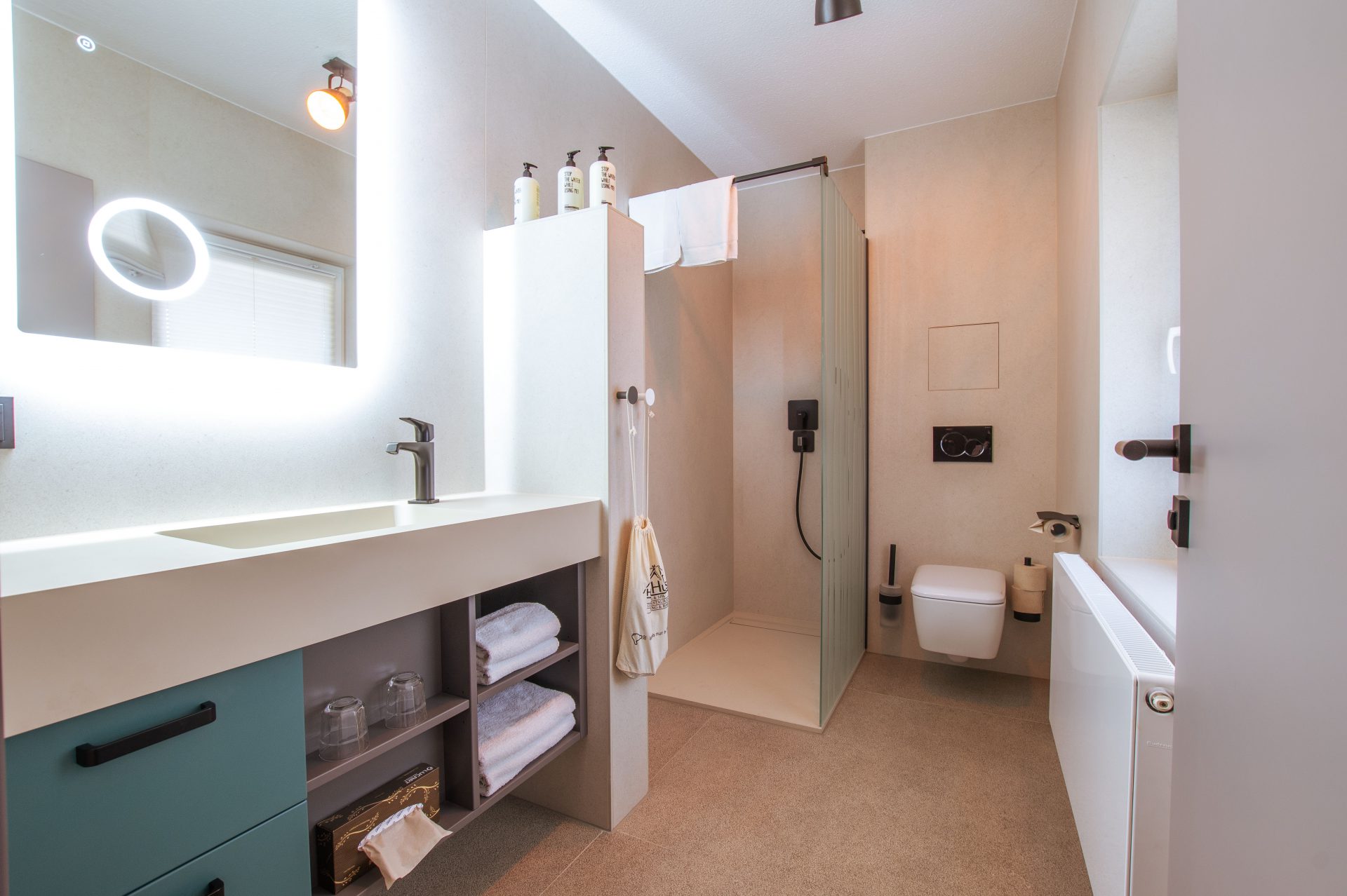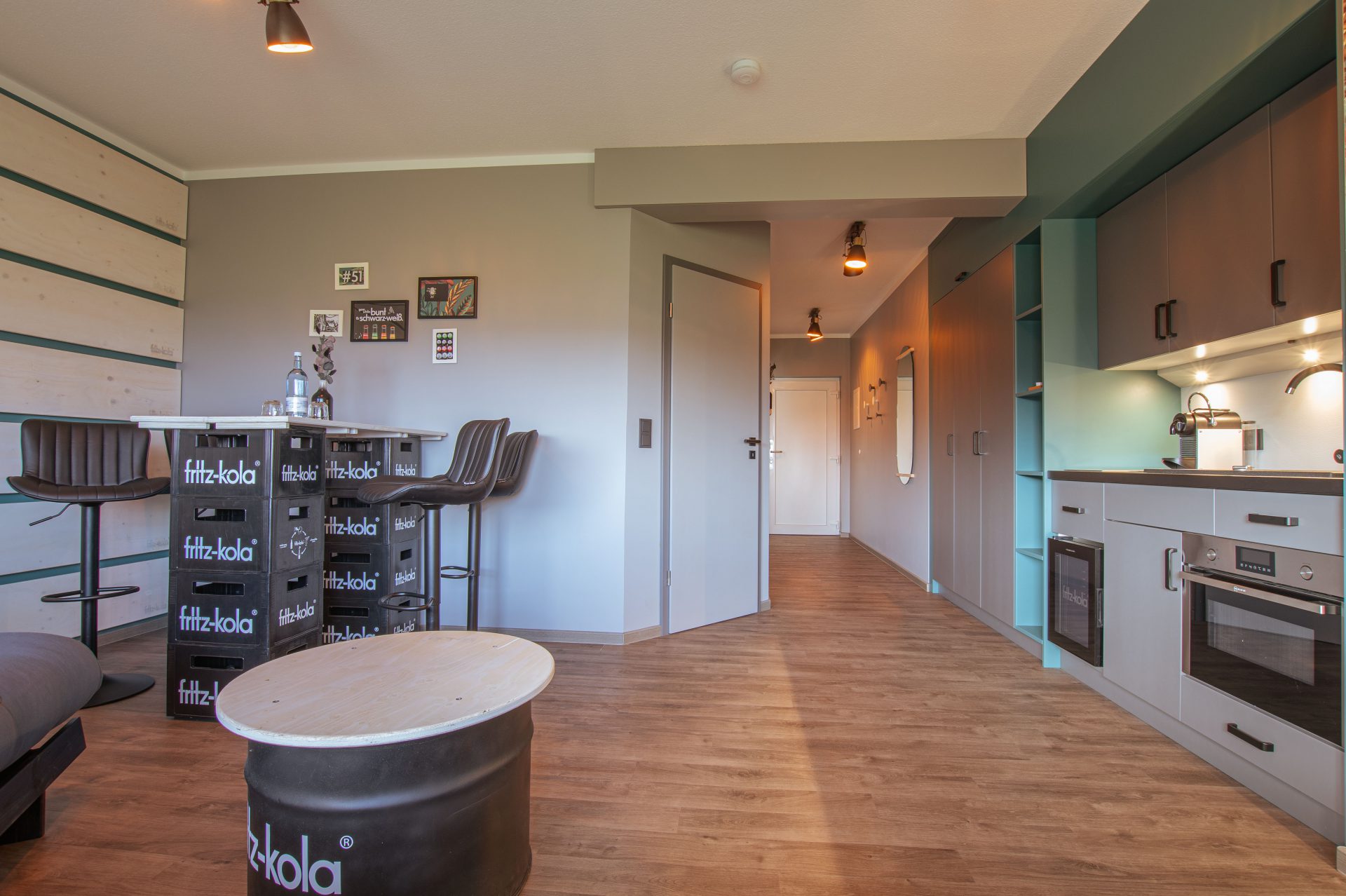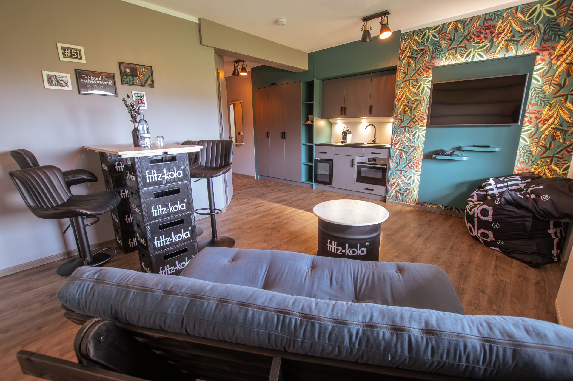 Dieses Motto-Apartment verbindet modernen Industriecharme mit tropischen Akzenten. Das separate Schlafzimmer mit indirekter Beleuchtung sorgt für erholsame Nächte. Im Wohnzimmer erwartet Sie eine gemütliche Loungecouch, Couchtisch, Bartisch mit vier Barhockern und zwei Sitzsäcken. Für zusätzlichen Komfort steht eine 140 cm Schlafmöglichkeit (für zwei Kinder oder einen Erwachsenen) bereit. Die Küche ist ausgestattet mit Getränkekühlschrank, 2-Platten-Induktionsherd, Multifunktionsbackofen und beleuchteter Arbeitsfläche. Als Willkommensgruß stehen Fritz-Limonaden und eine Flasche Güstrower Gourmet bereit.