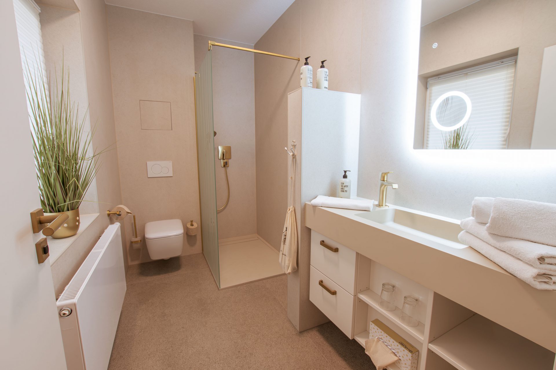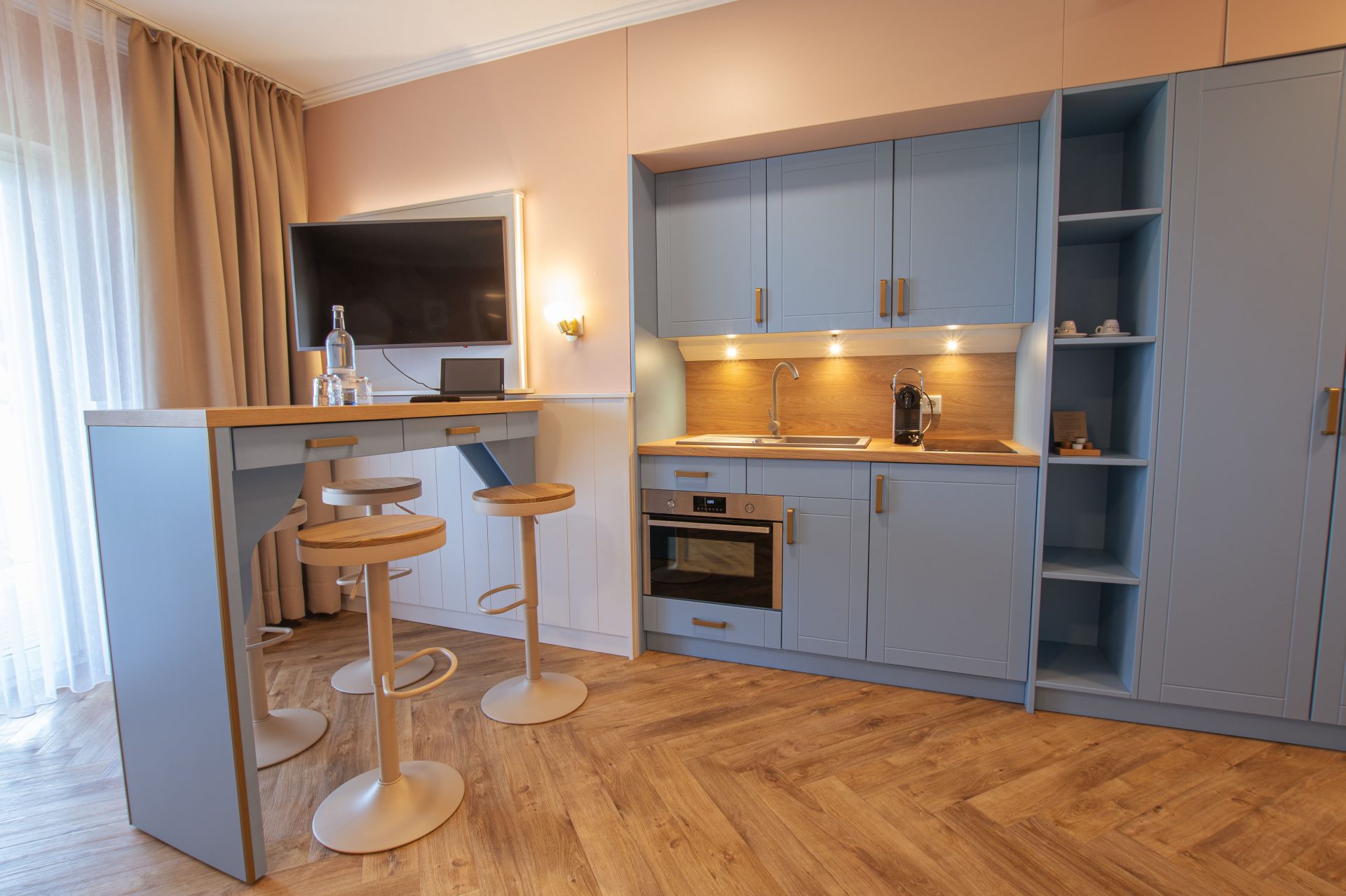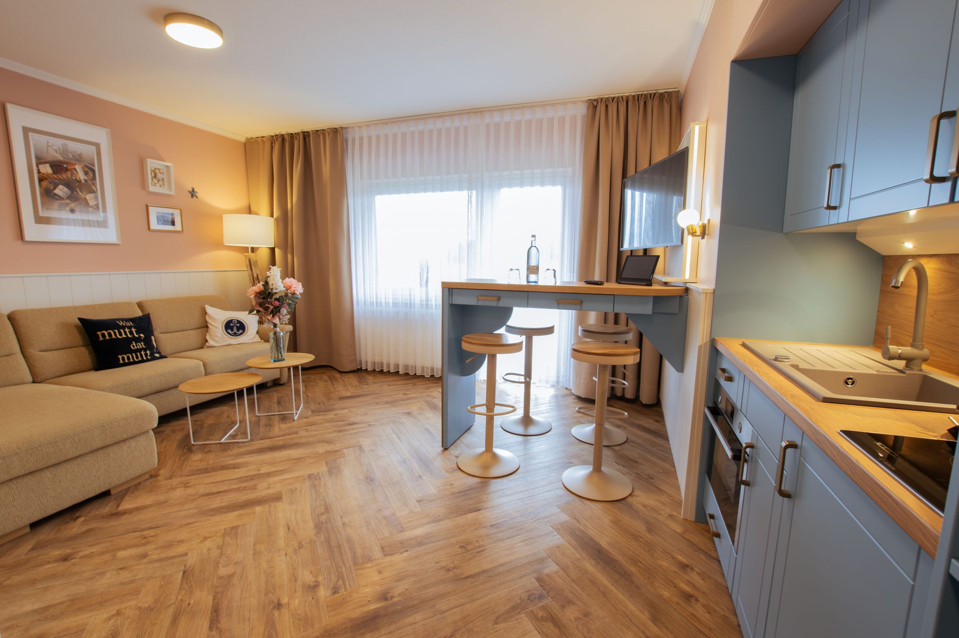 Modern, hell und freundlich eingerichtet – dieses Motto-Apartment bietet ein separates Schlafzimmer mit indirekter Beleuchtung. Im Wohnbereich befinden sich eine Couch, 2er-Couchtischkombination, Bartisch mit drei Barstühlen und ein großer Schrank. Eine 180 cm Schlafcouch bietet Platz für zwei weitere Personen. Die Küche ist vollständig ausgestattet mit Kühl- und Gefrierschrank, 2-Platten-Induktionsherd, Multifunktionsbackofen und beleuchteter Arbeitsfläche. Bei Ankunft erwarten Sie Knallköm Sekt und eine Flasche Güstrower Gourmet.